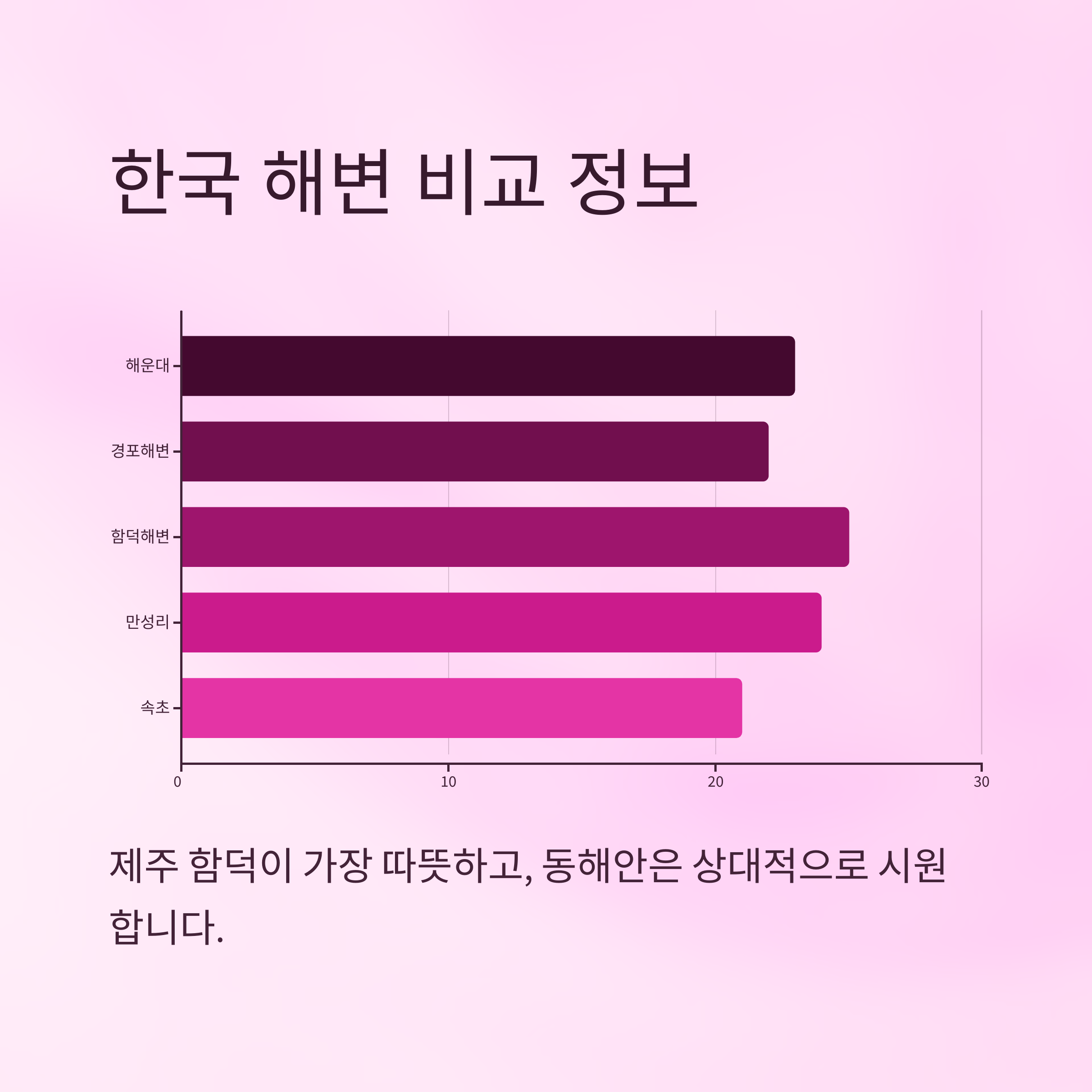 한국은 사계절이 뚜렷한 나라지만 여름철이면 전국 각지에서 바다를 찾는 여행객들로 붐벼요. 특히 깨끗한 바다와 편의시설이 잘 갖춰진 해수욕장이 많아서 가족 단위부터 커플, 혼행족까지 누구나 즐길 수 있답니다.