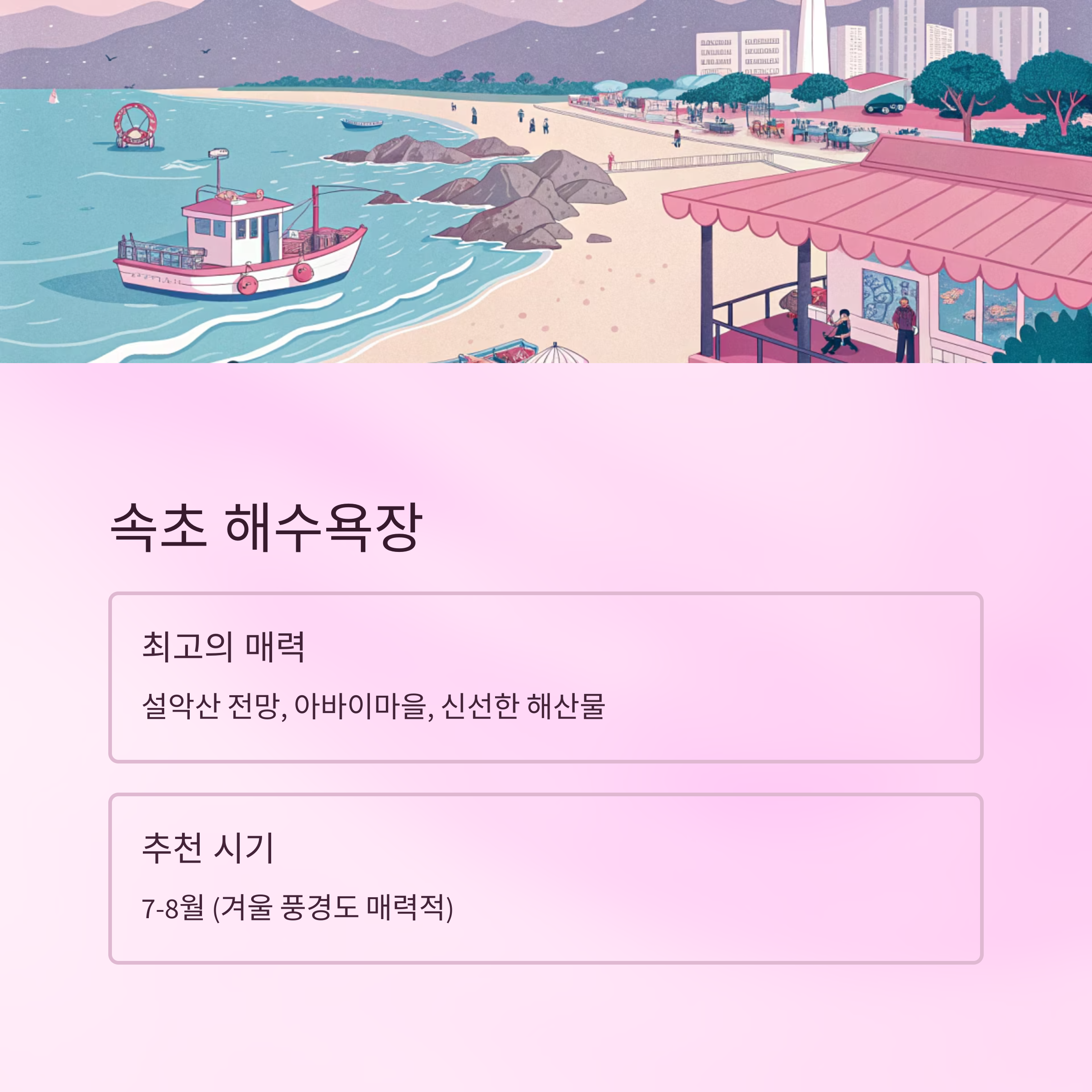 강원도 속초에 위치한 속초 해수욕장은 도시와 가까워 대중교통으로도 접근이 쉬운 바닷가예요. 도심 속 해변답게 편의시설도 잘 갖춰져 있고, 속초 시내와 바로 연결되어 쇼핑과 식도락도 함께 즐길 수 있어요.