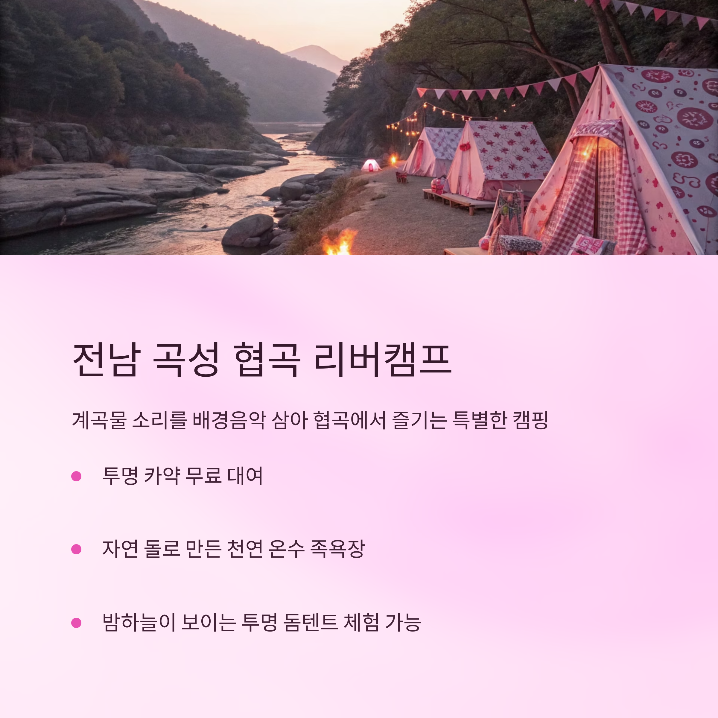 | 특징 | 계곡 옆 캠핑, 소음 제한 룰 |