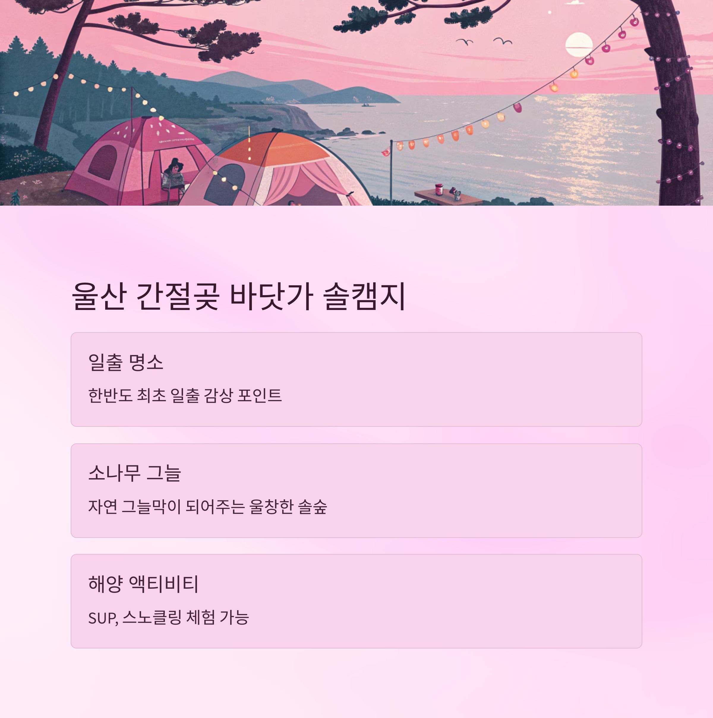 울산 간절곶은 해돋이 명소로 알려져 있지만, 그 뒤쪽 해안선을 따라가다 보면 소나무숲과 해변이 어우러진 솔캠(솔로 캠핑) 스팟이 있어요. 캠핑계에서 진정한 ‘혼자만의 시간’을 보낼 수 있는 곳으로 입소문을 타고 있죠.